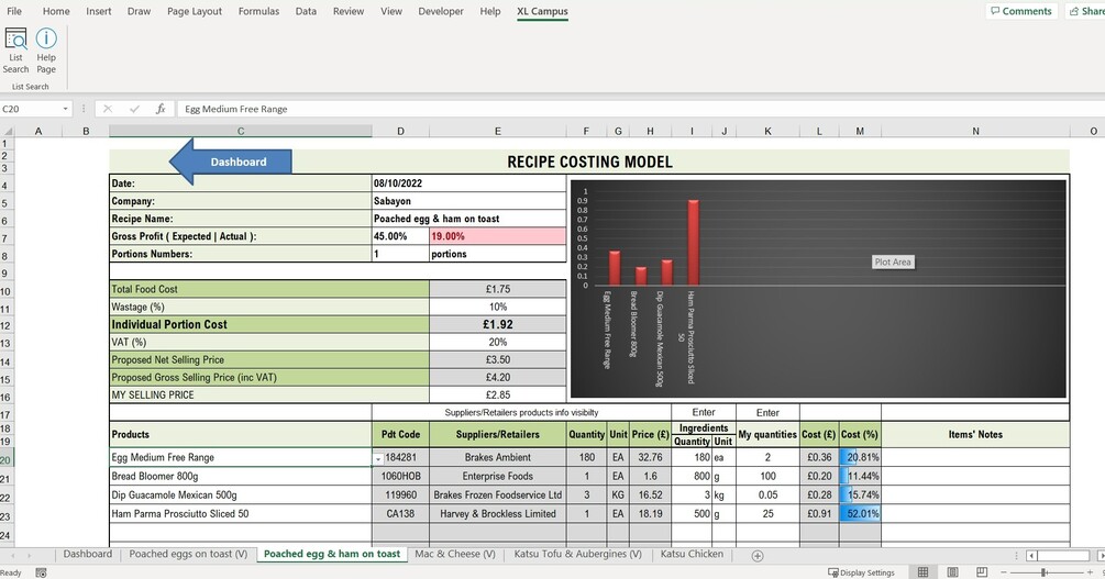 Dashboard: Worksheet displaying all recipes alongside costs information, can also be refreshed.